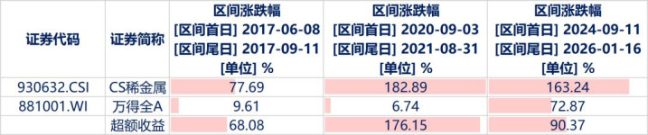 其中,最具参考性的应该是2020-2021新能源行情期间,CS稀金属上涨182.89%,相对万得全A产生了176%的超额收益。本轮行情中,自2024年9月11日至今,CS稀金属上涨163.24%,相对万得全A产生了90.37%的超额收益。