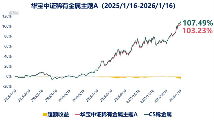 近1年,华宝中证稀有金属主题A上涨103.23%,同期CS稀金属上涨107.49%,跟踪非常紧密。